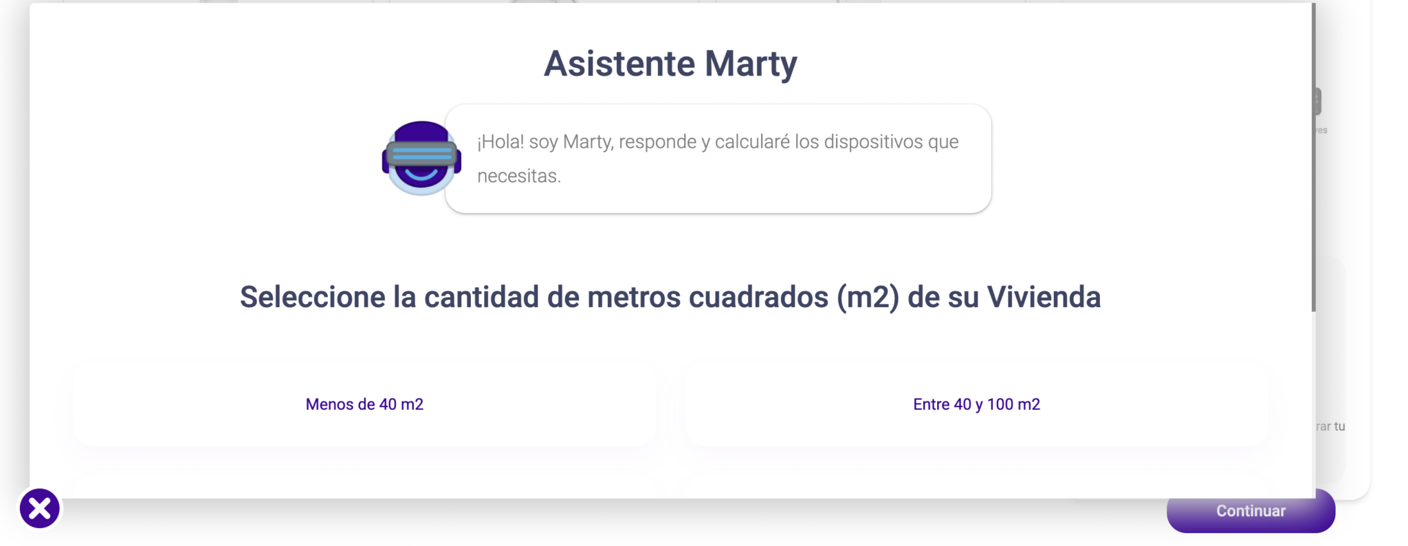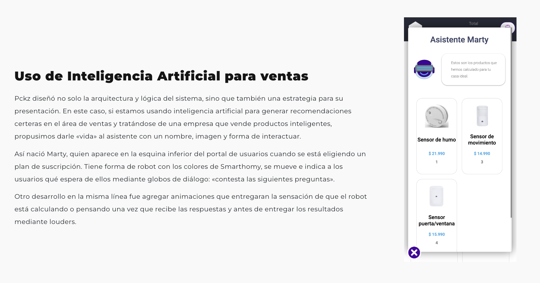 Diseñamos y desarrollamos un asistente virtual llamado “Marty” que ayuda a los usuarios de Smarthomy a encontrar los dispositivos recomendados para los distintos usos que quieran obtener en su casa inteligente. Marty es capaz de recomendar tipo y cantidad de dispositivos con sólo responder algunas preguntas, también añade uno o todos los productos al carro para que estén disponibles en el portal del cliente si los adquiere.